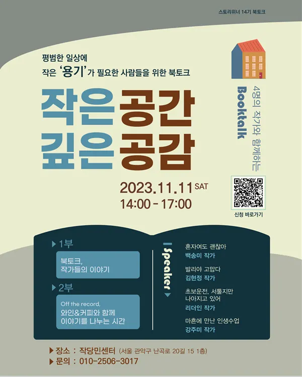 개최 목적 : 평범한 일상 속에서 작은 ‘용기’가 필요한 사람들을 위한 북토크. 단순히 작가들의 책을 소개하는 것을 넘어, 참여한 독자들이 각자의 삶에 적용할 수 있는 ‘용기’를 함께 나누고자 함.