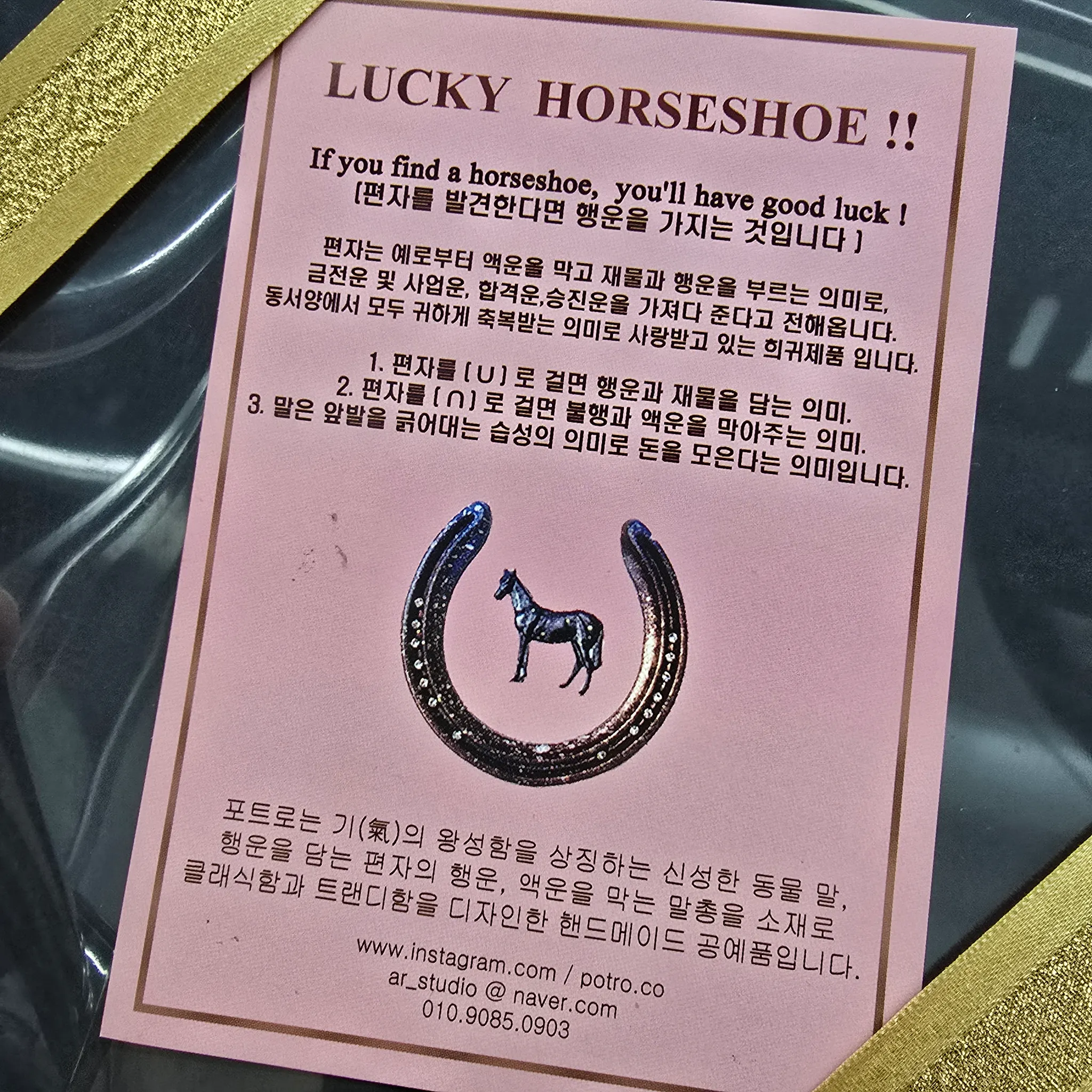 편자는 예로부터 액운을 막고 재물과 행운을 부르는 의미로, 금전운 및 사업운, 합격운, 승진운을 가져다 준다고 전해오는데요. 이 글에서 이 편자를 보시는 분들에게도 행운이 전해지실 거예요.^^