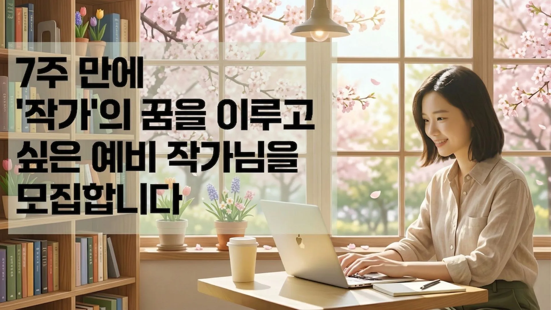 기간 : 2026년 4월 25일(토)~ 6월 13일(토) 7주 코스, 2026년 6월 10일(수) 책 출간 완료 온라인 런칭 모임 : 2026년 5월 2일 토요일 오전 10시 (1시간 30분 소요) 함께 책쓰는 날 : 2026년 5월 16일(토) 오후 1시~5시